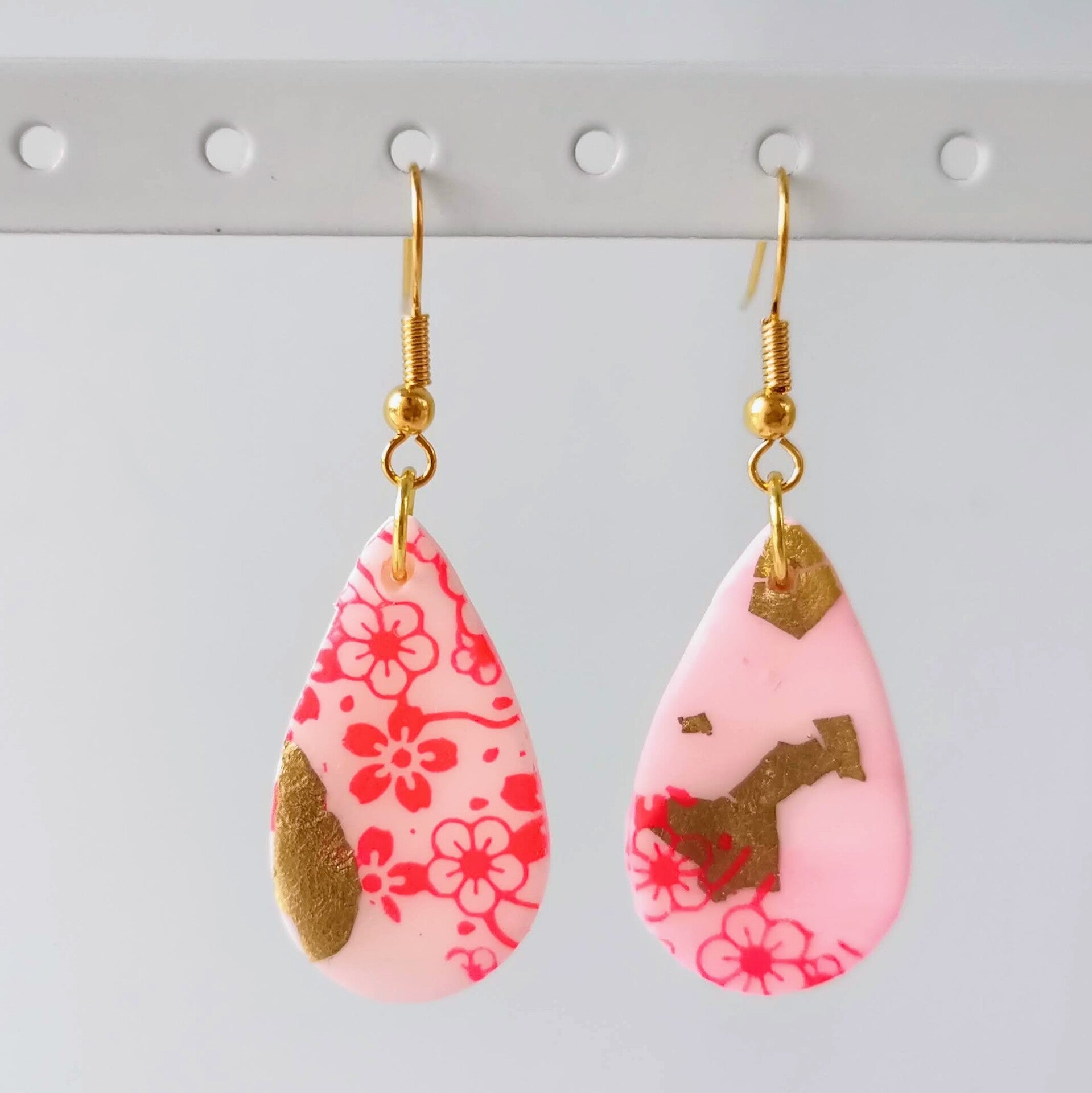 oorhangers in rose met felrose bloemen en gouden accent