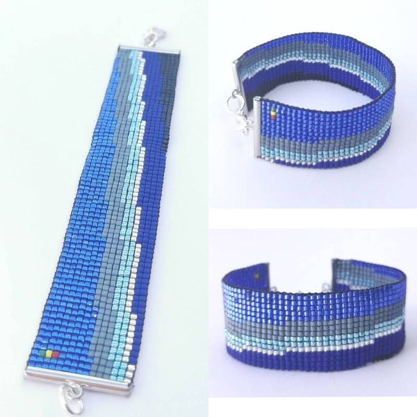 gewoven armband met Japanse miyuki kralen in verschillente tinten van blauw