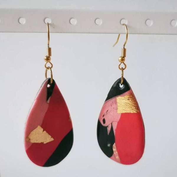 oorhangers in roze-rood-zwart met gouden accent